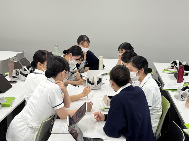 VRは臨場感を持って没入できるため、病院実習に近いリアルな感覚を得ることができる。VRの中で患者に近づき、まず全身状態や周辺機器を観察して、どの情報を拾うべきかを確かめる。ときには教員がヒントや問いかけを加え、学生が観察で得られる所見(今ある事実)に気づけるよう促す。授業ではそれを20分程度行った後、VRゴーグルをはずし、タブレットに画像を映してより詳細に検討する。次に3~4人のグループをつくり、観察した患者の状態と、回復過程の見通し(起こり得る経過)を話し合い、どう解釈するか考える。その際、患者が抱える身体的・心理的苦痛もふまえ、どのようなケアが必要かを議論する。さらに、患者の生活背景や家族との関係についても検討する。
