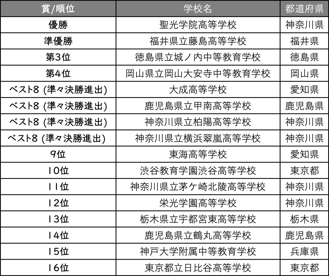 大会結果(上位16位までの学校)は表の通り