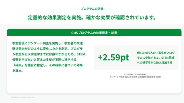 ただし、参加から大学進学までには数年の時間差があるため、直接的な効果測定は容易ではない。そこで財団では、参加前後の理系進路意向の変化をもとに、STEM学部への進学確率への影響を推定している。その結果は+2.59pt。10,000人が参加すれば、理系(STEM)進学者が259人増える計算になる。
