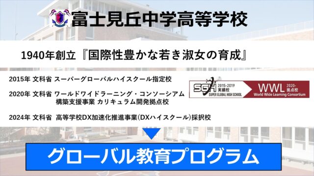 富士見丘中学高等学校は、2015年度にスーパーグローバルハイスクール※1、2020年度にワールド・ワイド・ラーニング※2に指定され、慶應義塾大学など国内外の大学、スーパーサイエンスハイスクール※3として指定された鹿児島県の池田中学・高等学校や、公益財団法人 地球環境戦略研究機関をはじめとした専門研究の機関、あるいは企業と連携した教育を展開してきた。2024年度には高等学校DX加速化推進事業※4にも採択され、3DプリンターなどのIT機器導入やプログラミング教材の活用も進むなど、探究的・文理横断的な学びを推進している。