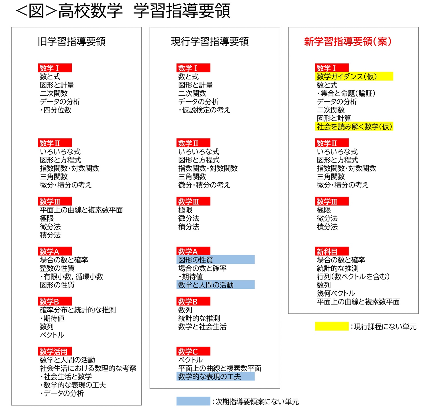 そこで、算数・数学ワーキンググループのサイトで検討状況を見てみると、高校数学は大きな変更がありそうなことが分かります。2月19日の総則・評価特別部会(第6回)配付資料に、各ワーキンググループの検討状況のまとめがあります。それを見ると、数学Ⅰに「高校卒業時に身に付けるべき数学的素養の基礎を学ぶ内容を新設」するとあります。また、「現行の数学A、数学B、数学Cを(中略)新科目として整理」するともあります。そのイメージ図も掲載されていますので、それを現行課程とさらにその1つ前の課程と並べて図にしてみました<図>